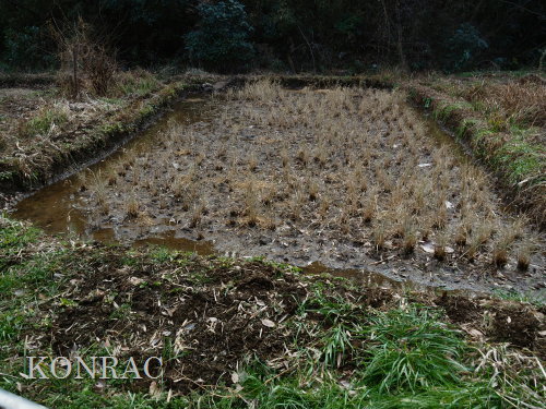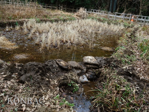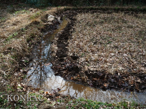 しかし、下の段には地面が広がっていました。 ただ、その土は湿った土でした。 水漏れ穴が見つかれば、それが原因だと思うのですが、非常に少ない流量の水が田圃の土に染み込んで消えているとしか考えられません。 畦沿いの溝を掘り直しながら、水漏れ穴かも知れないと思わせる穴を塞いで、外周の水面の輪をつくりました。