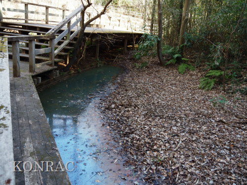 (ロ)竹林下辺りの谷戸左岸水流(湿地地区) 今までは、竹林と湿地地区の間の谷戸左岸水流の上端部は、湿地地区1段目からの水と竹林下谷戸からの水を、湿地地区2段目に入れるための場として管理していました。 これからは、谷戸左岸水流を上の田圃に水を供給するための水流として、意識的に保全することを考えました。 その保全管理の基本は、ホトケドジョウやオニヤンマなどの生物が、谷戸の水辺を自由に往来できることだと考えました。 現状は、竹林下の園路の路面が崩れて、柵が水流内に倒れ込んで、伐採材などを捨ててあったり、ヤブになったりしていました。 今回は、この合流部のアズマネザサやシダを刈って、除けられる材は除けて、水流の状態を確認できるようにしました。