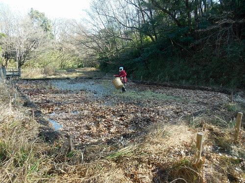 ●1/19(月) 下の田圃の水管理、上の田圃の落葉撒き、ハンノキ林のアズマネザサ刈りとアカメガシワの除伐(水田ビオトープ班)