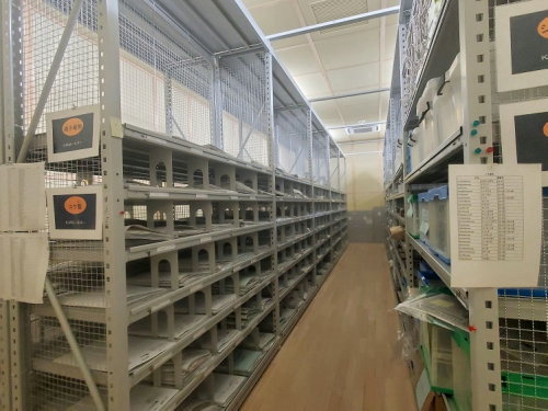 (上左)標本貼り付け作業、(上右)貼り付け済標本 収蔵庫配架・管理作業 *科・属・種に分けて、ファイルに入れ、科学館収蔵庫に配架 *古い標本の破損の修復・カビの除去など