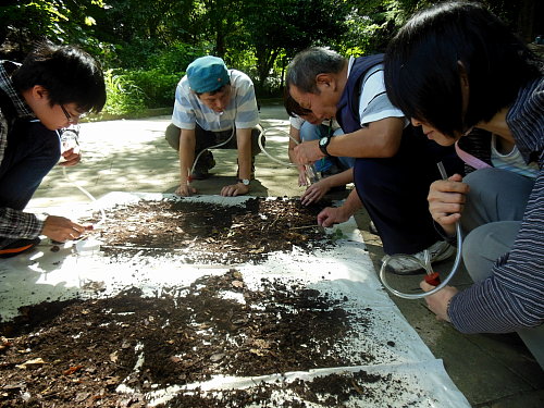 生田緑地観察会<土壌動物> 日時 2014/9/21(日) 10:00〜12:20 晴 場所 生田緑地 中央広場西端 参加者 15名(大人12名、子ども3名) 居住地別参加者 市内 9人、横浜市 2人、東京都 4人 ガイド 佐藤利奈、岩田臣生 特定非営利活動法人かわさき自然調査団水田ビオトープ班が担当する土壌動物の観察会です。 まず、土壌動物の採集をする土を採取します。 採取場所は、土壌動物の観察会のために落葉だけを捨てる場所として管理しています。