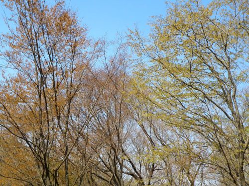 生田緑地の雑木林はうっすらと萌黄色を帯びていました。