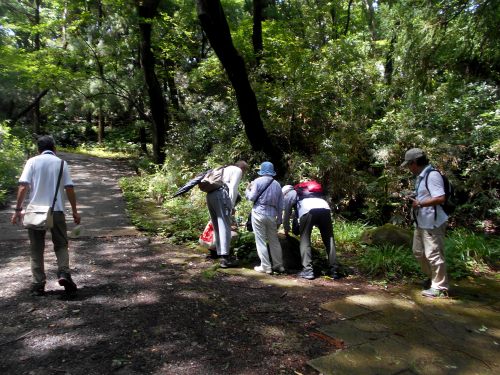 メタセコイアの林などの木陰の園路を歩きながら、台風による落枝・落果など、荒天後ならではの対象も含めて、参加者が見つけて、関心を示した生物を対象に観察会を進めました。