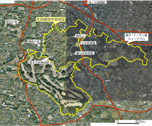 △生田緑地中央地区の植生図 2012年 面積表 (pdf) 植物(木本) 地質年代のような長期的なスパンで考えると、温暖な時代には南方からの樹林が優先し、寒冷な時代には北方から樹林が優先していたと思われ、 原植生は常緑樹のカシ類だと言われています。 江戸時代から昭和にかけては、薪炭づくりが産業として行われていた時代があり、コナラ、クヌギによる薪炭林がつくられていました。 関東地方西南部では、この歴史のために、薪炭林が価値を持たなくなった現在も、雑木林の主要樹がコナラ、クヌギになっています。 このことは、この辺りの昆虫相に影響していると考えられます。 生田緑地は、昭和16年(1941) に川崎市第 1 号の都市計画緑地として 165haが計画決定されました。 その後、少しずつ、用地買収が進められ、公園整備も行われ、様々な樹木が植栽されてきました。 従って、明らかな外来種も、国内外来種も、公園整備される前からあったものも、周囲の市街地から半ば自然にもたらされたものなど様々です。 <生田緑地の植物(木本)図鑑>(工事中) 植物(草本) <生田緑地の植物(草本)図鑑>(工事中) シダ植物 <生田緑地の植物(シダ)図鑑>(未着工) 昆虫などの小動物 生田緑地には、ゲンジボタルが棲息し、ホタルの季節には、市民公募によるホタル・ガイド・ボランティアの活動によって、 生田緑地ホタルの国を開国し、市民が川崎市内で、川崎の遺伝子を継承するホタルの光の舞を楽しむことができます。 生田緑地には老熟した樹木が生存していることで、毎夏、園路を歩いていてヤマトタマムシに出会うことができます。 神奈川県東部では急激に減少しているシオヤトンボ(神奈川県 要注意種)や、マユタテアカネ(神奈川県 要注意種)、ヤマサナエ(神奈川県 要注意種)などが普通に棲息しています。 また、サラサヤンマ(神奈川県 絶滅危惧IB類)、ホソミイトトンボ(神奈川県 情報不足)などの棲息記録もあります。 チョウでは、ミドリシジミ(神奈川県 準絶滅危惧種)、アオバセセリ(神奈川県 要注意種)などが棲息しています。 南方系のチョウでは、ナガサキアゲハ、クロコノマチョウ、ツマグロヒョウモンなどが普通に見られるようになっています。 外来のチョウでは、アカボシゴマダラが普通に見られるようになっています。 <生田緑地の昆虫図鑑>(工事中) <生田緑地のクモ図鑑>(未着工) <生田緑地の陸生貝類図鑑>(未着工) 両生類 <生田緑地の両生類図鑑> 爬虫類 <生田緑地の爬虫類図鑑>(工事中) 野鳥 <生田緑地の野鳥 図鑑>(未着工) 哺乳類 <生田緑地の哺乳類 図鑑>(未着工) |