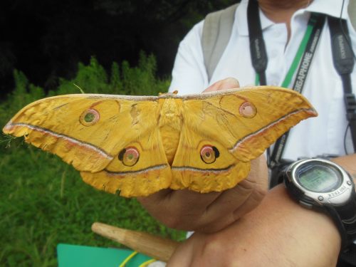 (上)ヤママユ♀抱卵 2014/9/13 生田緑地 岩田芳美 ▲ ヒメヤママユ 鱗翅目ヤママユガ科 Saturnia jonasii 開張 85〜105mm 北海道、本州、四国、九州に分布。生田緑地でも見られる。 雑木林のサクラ、ナシ、ウメ、クリ、クヌギ、ケヤキなどに棲息。 成虫は年1回、10〜11月に出現する。幼虫は多食性でバラ、スイカズラ、ブナ、ミズキ、カエデなど、種々の植物につく。卵で越冬する。
