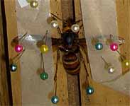 10:30〜12:00 午前中はスズメバチを使って昆虫標本づくりをしました。 大きなスズメバチを目の前にして、はじめは手がでません。 死んでいると言っても、刺さないのかと念をおしてきます。 勇気を出して、やっとのことだっただろうと思います。少しずつ触っていきました。 毛の感触、翅の感触、あしの感触、...。 昆虫の体が、頭部、胸部、腹部からなること、胸部から3対の脚(あし)と2対の翅(はね)がでていることを、手で触って確かめてもらいました。 やがて、思い切って、胸に針を刺します。 子どもたちは一つの壁を乗り越えました。