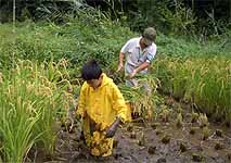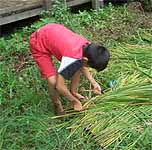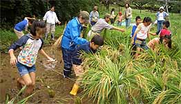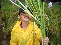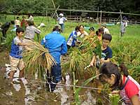 ともかく、一人ずつ順番に、田圃の畦から手を伸ばして、稲の刈り方を指導しました。 2順目ぐらいで、子どもたちから「田圃に入っていいか」、「入りたい」という声が出ました。替えの用意もしているというのです。 勿論、OKです。替えの用意がしてない子どもは裸足(はだし)になって田圃に入りだしました。 早速、泥田に尻餅(しりもち)をつく子どもがいました。子どもたちの長靴の中には泥水が入ってしまいました。 ようやく、田植えの時の感覚が戻ってきました。小さな鎌(カマ)を上手に使って、次々に稲を刈っていきます。 しかも、言われた通りに鎌(カマ)を交替で使っています。 時々、接近遭遇(せっきんそうぐう)しそうになることもありましたが、そばで見ていて、たまに手を貸すだけで上手に刈っていきます。 上の田圃の半分を刈り終えた時には安心して任せることができました。