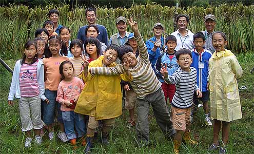 下の田圃は30分で終わりました。 全ての稲を干し終わって、稲の学習会を行いました。 イネの長さを測定しました。...118cmでした。 @イネの1株に何本の稲穂があるか調べました。1班は22本、2班は32本、3班は21本、4班は30本でした。 A稲穂1本についている籾(もみ)の数を調べました。 1班は、@22本、A143粒 2班は、@32本、A136粒 3班は、@21本、A140粒 4班は、@30本、A124粒 サンプルの平均は、@26本、A136粒と計算されました。1株のイネには3536粒の籾(もみ)がついていると推計されました。 2班の野上さんの調べでは、上の田圃の株数は375株(概算)だったそうです。 従って、上の田圃で実った籾(もみ)の数は132万6千粒と推計されました。