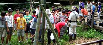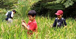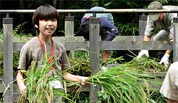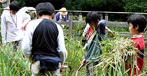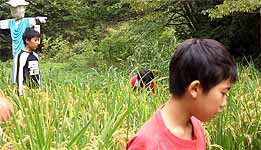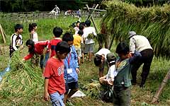 班ごとに数えた結果は次の通りでした。 A班 1,264 B班 2,173 C班 1,775 D班 2,672 E班 3,263 F班 1,554 G班 3,205 H班 2,334 I班 1,403 J班 1,120 その間に、上側の田圃(2005年度再生の田圃)の稲刈りをスタッフの手で進めました。