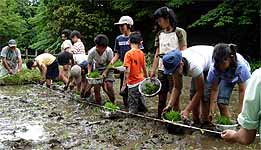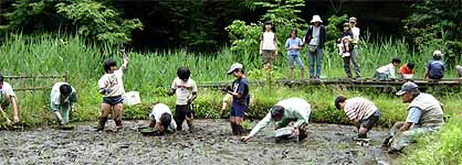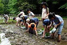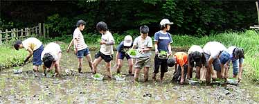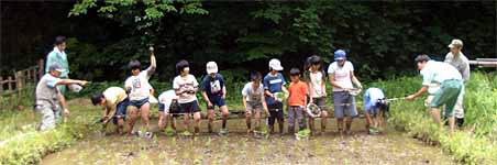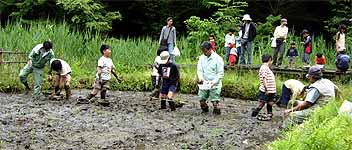 一番上の田圃の次は一番下の田圃です。代掻きをしてから時間が経っていたため、ミゾソバ、セリ、タガラシなどが生育しており、それらを取りながらの田植えとなりました。 この田圃は深いため、パスする子どももいましたが、逆に、深い泥田を楽しんで、駆け回る子どももいました。