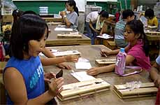 午後は、チョウの展翅(てんし)を学習しました。鱗粉(りんぷん)を落とさないように注意して慎重に作業をしていました。