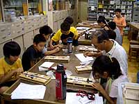 場所 青少年科学館実験室 参加者 1班 堀亮平、岡崎湧介、神山幸雅、永木稜晟、山内冴香 2班 神山歩未、宮部耕佑、小倉優里、福江祥充 3班 横山卓哉、日野原佳子、森雄大 4班 内藤朱香、古田潤、本多吉之、小俣日向子 5班 山内春香、永喜誠洋、須田大貴、舘野枝里嘉 20人 講師 山本晃、岩田芳美・臣生 今日は、山本先生による昆虫標本づくりです。スズメバチを使って昆虫の体の構造を学習してから展翅にかかりましたが、やはり初めてのスズメバチは恐くて、恐る恐る指を触れるところから始まって、つかめるようになるまでには少し時間を要しました。