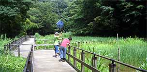 午前中はハンノキ林での土壌動物調査で、調査結果は第7次川崎市自然環境調査の枠組みに入れることを前提として、本格的に50cm四方の区域を設定し、表層5cmを対象として、吸虫管を使って拾いだしを行いました。 第1調査区は、ハンノキ林の下草刈りをした次の写真の区域としました。