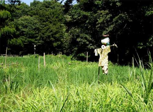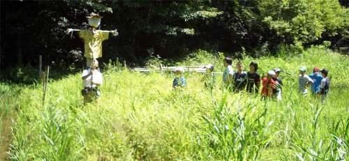 完成した案山子を持って、田圃へ向かいます。 上の田圃の上と下に立てることにしました。どちらに立てるかはジャンケンで決めました。
