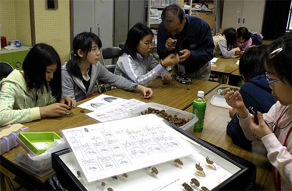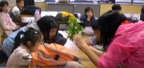 さて、雨はまだ激しく降っています。 10分の休憩の後で、山本先生から、アカボシゴマダラの話をして戴きました。 山本先生は、飼育していたアカボシゴマダラの幼虫や蛹を用意していてくれました。 生きている現実の生物を見て、触れて、アカボシゴマダラがどんな生き物かを学習しました。 関東地方で問題にしているアカボシゴマダラという蝶(チョウ)は中国産のアカボシゴマダラを藤沢市の某氏が放蝶したもので、 次第に分布域を広げており、生田緑地では2006年には非常に珍しい存在でしたが、2008年には普通に見られる蝶になってしまいました。 在来のゴマダラチョウと同じ様な生態でありながら、1年に4回も世代交代を繰り返すなど繁殖能力が勝っており、 ゴマダラチョウが駆逐されるのではないかと危惧されています。 子どもたちが野外で見つけた時に判別ができるように、見分け方の詳しい説明がありました。 食樹はエノキで、藤間先生の指導でエノキの観察も行われました。エノキの実が食べられると聞いて、食べてみたいと思った子も何人かいたようです。