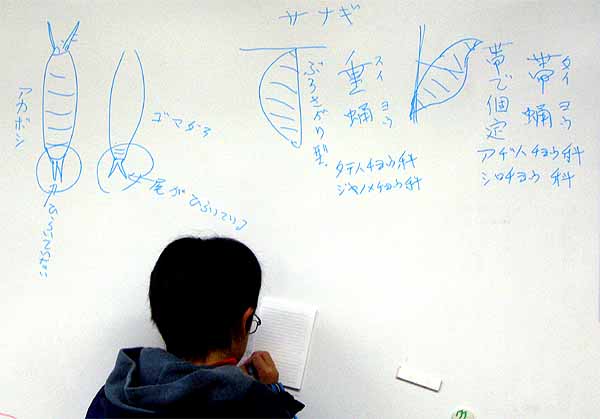 午後は、皆でできる自然調査《セミ調査》に基づいた川崎のセミについて学習しました。 川崎では平地生のセミ7種が棲息していますが、地域によって違いが大きいこと、 一番多く、広く分布しているのがアブラゼミであること、 ミンミンゼミは多産の年でもアブラゼミの10分の1程度の数であること、等々調査結果に基づく説明がありました。 これら7種のセミの脱殻の見分け方についても学習しました。 ニイニイゼミは早い時期に発生し、脱殻は小さく、表面に泥がついているのが特徴です。 アブラゼミとミンミンゼミの区別は触覚を調べないと判断できないこと、つまり触覚の第3節が長いのがアブラゼミの特徴であることを学習しました。 また、セミのオスとメスの判別の仕方を学習しました。 この二つのことができるようになったところで、皆でできる自然調査で集められたセミの脱殻のうち、 アブラゼミとミンミンゼミの分類がされていない脱殻を手分けして分類する作業を行いました。 その結果、ミンミンゼミの脱殻数個体が分けられ、アブラゼミについてはオスとメスの数が次の様になっていることが明らかになりました。 脱殻採集日 メス♀ オス♂ 8/5 14 45 8/7 12 17 8/8 17 36 8/9 24 33 8/14 40 36 8/17 29 31 8/22 31 22 8/29 34 25 発生初期にはオスの羽化の方が多く、8/14〜8/17に逆転し、メスの羽化が多くなることが、これから分かります