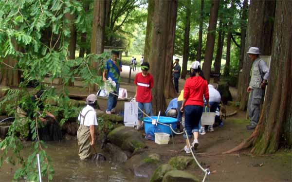 奥の池では午前中から「生田緑地の谷戸とホトケドジョウを守る会」が活動していました。 この活動に参加して、奥の池で大量に発生したウシガエルのオタマジャクシを採集する活動を行いました。 ウシガエルは特定外来生物に指定されており、生田緑地における侵略的外来生物として生田緑地植生管理協議会で決議しています。 ウシガエルは5〜9月に1〜2万個の卵を産み、幼生(オタマジャクシ)の状態が越冬し、夏がくると手足を出して幼体となります。 奥の池のオタマジャクシは手足を出し始めています。幼体も見られます。これらが上陸して広がる前にできるだけ捕獲しなければならないと考えています。 里山の自然学校の子どもたちも参加できるようにと、北部公園事務所に頼んで水を落としてもらいましたが、 結局、池に入る子どもはいませんでした。 里山ノートには、服装・持ち物について「毎回、着替えや履き替えは用意しましょう。」と明記してあります。 保護者の皆さん、よろしくお願いします。
