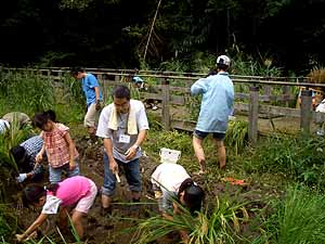 私たちの田圃は、時々不可抗力で水を干してしまうことがありますが、基本的にはいつも湛水しています。 稲刈りのために周囲の泥を畦の上に掬い出して溝をつくり、その部分にだけ水が流れている状態にしています。 稲をつくるという視点からは適切ではないようです。中干しや稲刈り前の2〜3週間は干してしまわないといけないようです。 ここで田圃をやっていたYさんには、よく注意されました。 しかし、田圃を干しあげるためには、そこに棲息していた生物が避難していられる水域を用意してあげなければならないと思います。 そんな切り換えをやり切る自信はありません。 そこで、こんな方法をとってきました。 そんなわけで田圃の土は、稲刈りの時も田植えの時と余り変わらない状態になっています。 泥に足をとられて体を移動するのが大変です。思うように歩けません。 土が年々柔らかくなってくるのは良い土になっていることだと考えていますが、普通の稲刈り風景とは異なる景色が毎年展開されます。 そんな泥田にも子どもたちは平気で入って、稲を刈っていきます。暫くすると泥まみれの靴が田圃の周囲に転がっていました。
