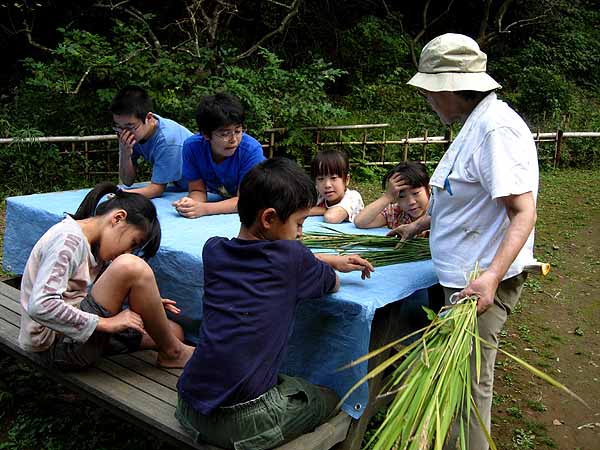 木道では稲束づくりが進められました。 簡単なようで、実は結構大変な作業です。 縛り方が緩いとイネがオダから抜け落ちてしまいます。 藤間先生とお母さん方の3人が頑張りました。