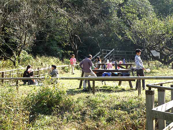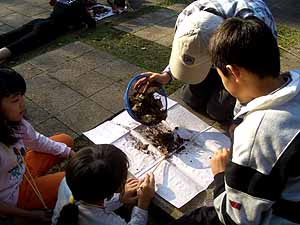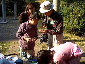 秋の陽射しは急に傾いて木々の影を広げてしまいました。 1時間ほどで切り上げ、枡形山広場に行きましたが、人が多く、トイレ休憩をしただけで東口経由で青少年科学館に向かいました。 青少年科学館実験室で、里山ビンゴ表にそって今日出会った生き物を整理して、解散しました。