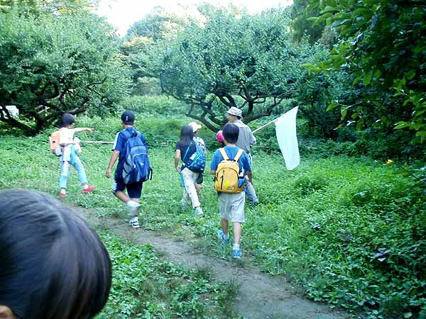 場所 生田緑地 参加者 A班/野村麻理亜、岩野可菜子、工藤思由 B班/川村美涼、須藤有弥、島田耕助、増沢知泰、森田龍平 C班/鈴木萌恵、井原沙羅、大江田 慧、木村陸樹、佐藤夕波、島田真衣、山内雄仁 D班/大島万奈、豊島芳璃人、中瀬晴香、江口暁香、木本百香、鈴木こころ、高村慶太朗、原田大雅 OB参加 須藤早紀、尾崎基和、尾崎光歩 26人 講師 藤間煕子、中臣謙太郎、山本晃、鈴木志歩、岩田芳美、岩田臣生 夜の昆虫観察は枡形山広場でライトトラップを行い、光に集まる昆虫を観察します。 朝までには雨も上がって、風の無い、蒸し暑い天候となり、ライトトラップができそうです。 旧北部公園事務所裏に集合して、まずは夕方の谷戸の生き物観察を行いました。