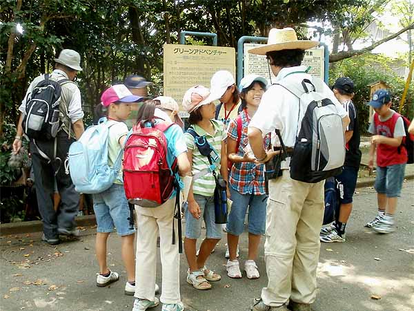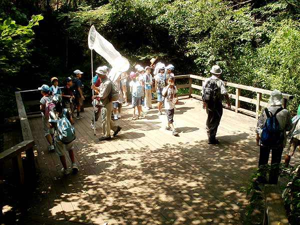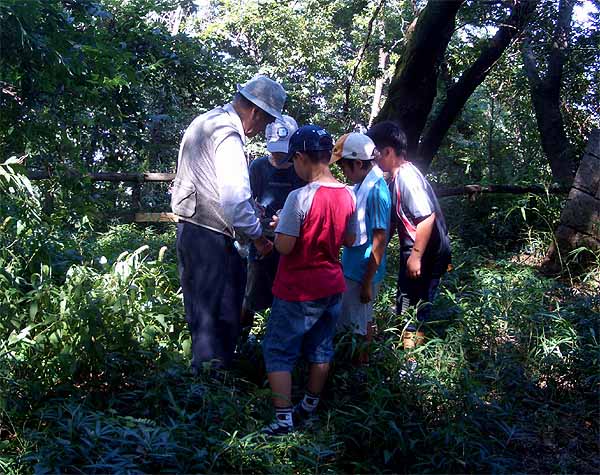 場所 生田緑地 参加者 鈴木萌恵、内藤義人 井原沙羅、大江田 慧、木村陸樹、木本百香、工藤思由、酒見果歩、佐藤夕波、島田真衣、鈴木こころ、 須藤有弥、野村麻理亜、原田大雅、増沢知泰、松本歩実、三橋修、森田龍平、山内雄仁 19人 講師 藤間煕子、中臣謙太郎、山本晃、神山歩未、岩田芳美、岩田臣生 もう夏休みも終りに近づきました。旧北部公園事務所裏に集合して、生田緑地での"夏の里山"体験に出発です。 どんな生き物に会えるかな。どうな一日になるのかな。 ヤードにはクヌギの枝先が沢山落ちていました。見ていると、時々、落ちてきます。 その枝を良く見ると綺麗に切断されています。どうしたのでしょう? ハイイロチョッキリの産卵シーズンになったようです。ドングリにはちいさな孔が開いています。 まず、こんな生き物の話をしてから出発しました。