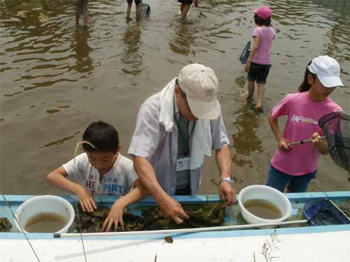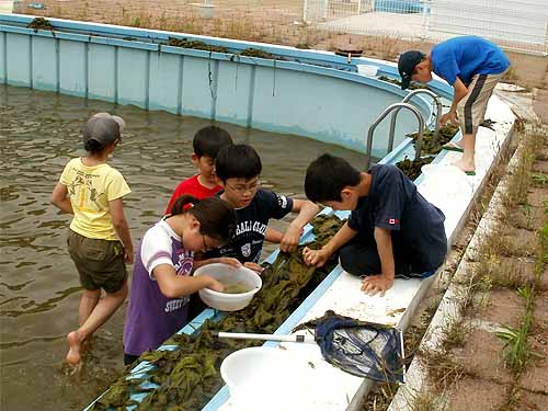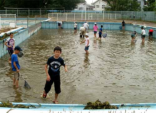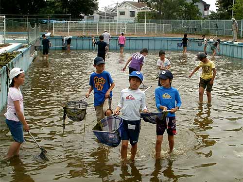 場所 稲田公園児童プール(川崎市多摩区) 参加者 A 山内雄仁、酒見果歩、谷 実鈴 B 野村麻理亜、原田大雅、大江田慧、上野美紀、丹羽小蒔 C 内藤義人、江口暁香、吉田光誠、島津千咲、梶 創真、山本来幸 D 豊島芳璃人、井原沙羅、吉田太誠、高田泰成 OB 森田 19人 講師 藤間煕子、山本 晃、梅原和仁、神山歩未、岩田芳美、岩田臣生 第3回里山の自然学校は「プールのヤゴの救出作戦」です。 これは、川崎市北部公園事務所が、2004年に当該児童プールの開業の準備としてプールの塗装をするための排水をしようとしたところ、 沢山のヤゴが生息していたことから、そのまま下水に排水してしまっていいだろうかという相談を当調査団に戴いたことから始まりました。 ヤゴを救出するという目的のために、活動前に水位をどこまで調整するかということは、毎年、相談しながら試行錯誤を繰り返し、 浅い方のプールに水がとどくかとどかないかぐらいの水位が適当ということで落ち着いていました。 ところが、今回は当日の朝、プールに着いて驚いてしまいました。 何と、水深12〜13cmになっていました。 ここまで排水してしまうと大部分のヤゴが下水に流されてしまったのではないかと考えられたからです。 2年目の子どもたちは、何でこんなに水が少ないのかと聞いてきました。