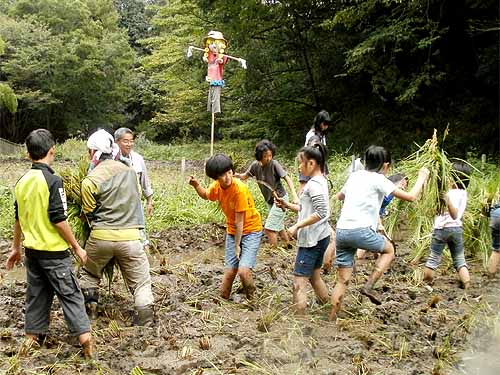 田圃のイネは辛うじて立っているように見えました。 田圃の外周にはたっぷりと水が溜まっています。 このため、子どもたちは裸足になって稲刈りをします。