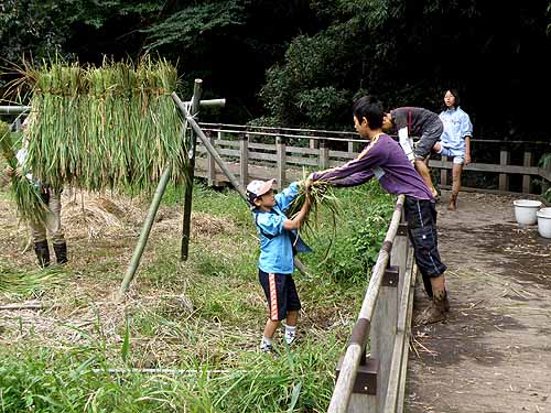 場 所 生田緑地(川崎市多摩区) 参加者 A 鈴木萌恵、山内雄仁、酒見果歩、谷実鈴、内藤真衣 B 野村麻理亜、原田大雅、大江田慧、上野美紀、金田大輝、丹羽小蒔 C 内藤義人、江口暁香、吉田光誠、島津千咲、山本来幸 C 豊島芳璃人、井原沙羅、吉田太誠、高田泰成 20名 講 師 岩田臣生、岩田芳美、梅原和仁、鈴木志歩、藤間煕子、山本 晃 金子文隆、小泉恵佑、佐藤利奈、前田 宏 9名 生田緑地に着く頃になって、曇り空から雨粒が落ち始めました。 果たして稲刈りができるのかと思いつつ子どもたちを迎えました。 天気予報は、天気の回復を知らせていました。 公園事務所の会議室を借りていましたので、室内で様子をみようとしましたが、間もなく雨も止みました。