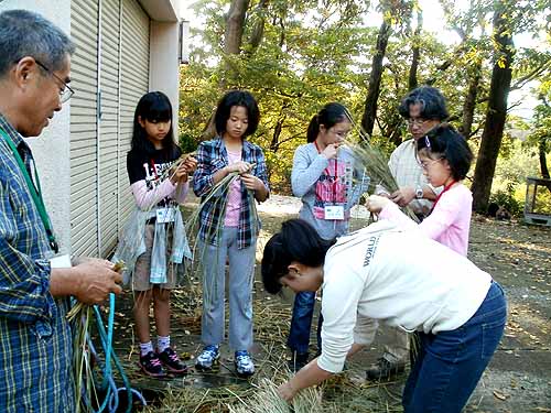 お昼のお弁当を食べ終わると直ぐに稲ワラ細工が始まってしまいました。 山本先生が稲ワラのない方を教えてくれました。