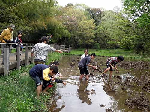 ハンノキ林上の池では、オタマジャクシを見つけて、捕まえ始めました。 里山3年生はヌカエビをすくっていました。 ここでは全員が活動するのには狭すぎます。 また、一見浅く見えますが、実際は深くて、ここで泥だらけにしてしまうと後が大変です。 アズマヒキガエルのオタマジャクシだという話だけにして移動しました。