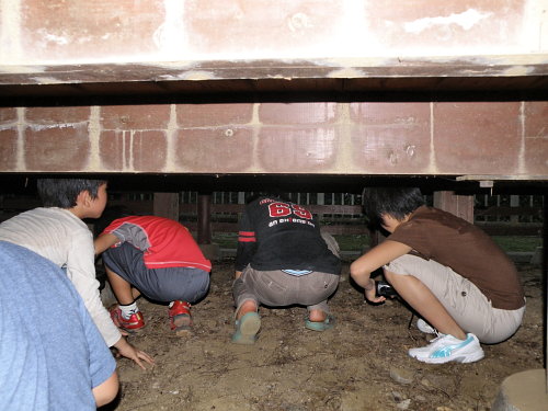 アリジゴクの観察をしました。 アリジゴクはウスバカゲロウの幼虫です。 2年目以上の子どもたちは当然のように、サッサと縁の下に入って行きます。 初めての子供もつられて入ります。 それでも、何人かは入れなかったようです。 また、何匹も捕まえた子もいれば、1匹も捕まえられなかった子もいたようです。