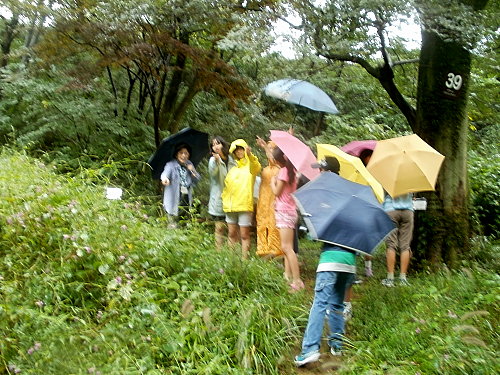 今年の稲の穂は1株当たり 12.6本、籾は 1231粒でした。 A 12本 1039粒 B 11本 1464粒 C 15本 1191粒 籾の数を数える活動は終わりましたが、まだ雨が降っています。 例年は、かなり時間がかかっていたと思ったのですが、今日は直ぐに終わってしまいました。 お弁当にも早いので、ピクニック広場に降りて植物観察をすることにしました。