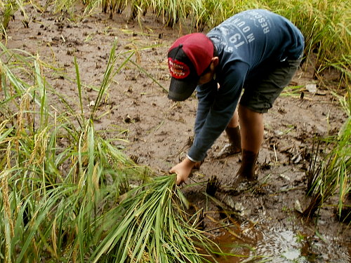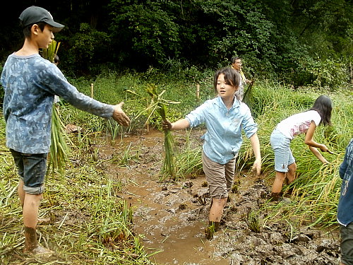 また、今日は泥田に入るのをためらう子どもも無く、全員が協力して、上の田圃の下の段の稲刈りは、予想以上に短時間で終わりました。