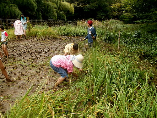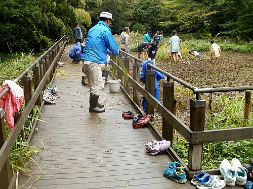 ピクニック広場には、ツリフネソウが咲いています。 まだ、実は青くて、弾けるところまでは熟していませんが、子どもたちは弾けそうな実を探していました。 公園管理事務所の2階でお弁当を食べてから、田圃に降りました。 雨は完全にはあがっていない感じでしたが、稲刈りを始めることにしました。 稲刈りは、2人ずつチームを組んで行います。 ノコギリ鎌は各チームに1本です。