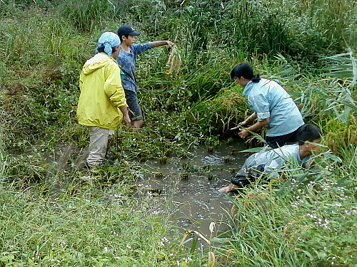 上の田圃の上の段は泥が深くなり、裸足でアメリカザリガニを踏んだり、疲れも出てきたのか、急にペースダウンしてしまいました。 アメリカザリガニの方に関心が奪われた子供も多かったようです。 侵略的外来生物なのに、子どもたちの人気は高く、持ち帰りたいという子どもが何人も現れます。