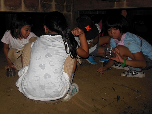一部の子どもたちはスジグロボタル幼虫の光の明滅も観察しました。 階段の手すりにアカイラガの幼虫がいました。 稲目谷戸の降り口に戻ったところで、カブトムシで遊びました。 生田緑地から持ち出した幼虫を羽化させたものを、生田緑地に放しに来た人がいたようです。
