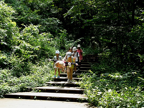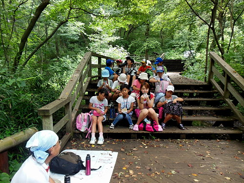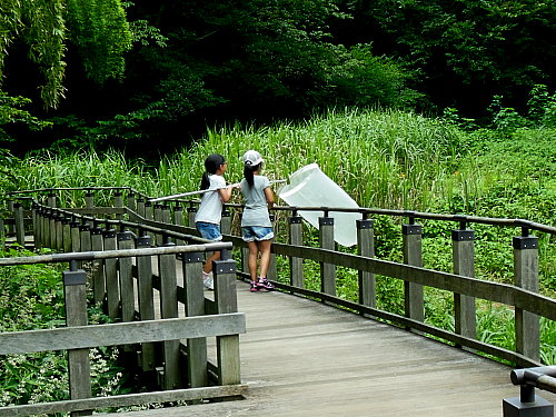 この池はデッキからの階段などがあるために手網での採集が難しいのです。 トラップを仕掛けているのですが、悪戯も多く、また小さいものは自由に逃げられてしまいます。 そこで、ザリガニ釣りがいいと思っていたのですが、来園者の多い場所で、大人がザリガニ釣りをするのは躊躇われました。