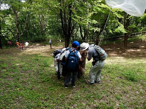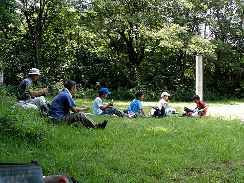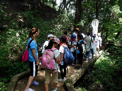 場所 生田緑地 参加者 志歩班/石井恵梨華、小竹森英響、小林海音、佐藤りん、薬袋吹喜音、山根将聖 歩未班/稲垣志帆、大島弥子、目黒陽菜、八代舜太郎、山本来幸 12人(含む、氏名非記載者1人) 講師 岩田臣生、岩田芳美、梅原和仁、神山歩未、鈴木志歩、山本 晃 夏のプログラムが「夜の昆虫観察」、「案山子づくり」、「夏の里山」と続き、猛暑のせいもあると思いますが、負担に感じるようになっています。 来年度は回数を減らさせてもらおうかとさえ思い始めています。 何回かの活動を通して友達ができると、その友達数人だけの世界をつくってしまって、皆で一緒に学習するという雰囲気ではなくなってきて、運営する側にとっての楽しさが低下してきたように思われました。 そこで今回は強引に2チームに分けて、少し競争させてみることにしました。 チームはジャンケンで決めました。仲良しグループを少し崩す試みです。 真夏の里山は出会える生き物が意外と少ないのです。 生き物を探して、見つけた生き物の数を競わせることにしました。 如何に目や耳を使って観察し、記録するかが問われます。 記録していないと、発表する時に忘れていて、名前をあげることができないこともあります。 植物は花や実を確認できたものだけにしました。 にわか仕立てのチームの勝敗を、子どもたちがどれだけ意識するか分かりませんが、里山観察をより活発にしたいという試みです。