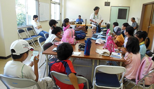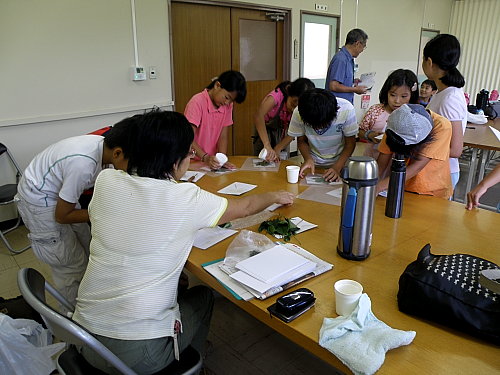 暑さの厳しい野外に出ました。 早速、何か見つけたようです。 ただ、勝敗を意識して他の人に教えないようにしたために、結局、最後の発表の時には忘れていて名前をあげることができなかったということもあったようです。 これも勉強ですね。