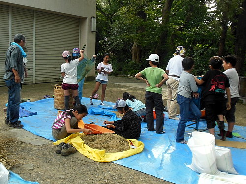 場所 生田緑地 参加者 3年目 山本来幸 2年目 駒松汰生、山崎慎悟、八代舜太郎、山根将聖 1年目 池田龍平、稲垣志帆、小竹森英響、小林海音、佐藤りん、新保善文、鈴木彩香、鈴木優香、薬袋吹喜音、目黒陽菜 OB 甲斐亮汰 17人(含む、氏名非記載者1人) 講師 岩田臣生、岩田芳美、梅原和仁、藤間煕子、山本 晃 サポート 政野祐一、Paul Massie 今日は脱穀です。 幸い雨は翌日に延びました。 9時から生田緑地整備事務所のバックヤードの掃き掃除から準備を始めました。 作業のためのブルーシートは敷いて、脱穀機と唐箕を出しました。 脱穀はプログラムの中で最も大変な活動です。 サポートには、今朝入団手続きをする政野さんと先月入団したばかりの Paul Massie さんが参加してくれました。