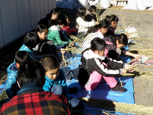 基本は3本ずつの藁をよりあわせていくのですが、子どもたちの手は小さいのに、いきなり太い縄にしようとした子は上手くいきませんでした。 細い縄を綯う練習を繰り返していると、段々とコツが分かってきます。 この日は時間もタップリありましたので、全員が綯えるようになったと思います。