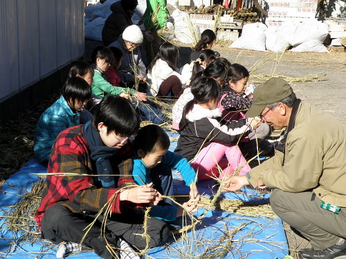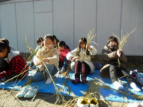 場 所 生田緑地 参加者 山本来幸、小竹森英響、稲垣志帆、佐藤りん、鈴木優香、鈴木彩香 大島弥子、小林海音、目黒陽菜、中川 悠、沼澤咲季、江崎 慧、山下はなの、田村 和 14人 講 師 岩田臣生、岩田芳美、梅原和仁、神山歩未、藤間煕子、山本 晃 サポート (里山の自然学校卒業生)神山幸雅 第10回里山の自然学校は「つくってみよう」です。 「つくってみよう」は2010年以降、改築などの理由で施設を利用することができなくなったためにプログラムから外していました。 今年は、稲田公園児童プールの改修工事のために「ヤゴの救出作戦」をプログラムから外さなければならなくなりましたので、 代わりに、「つくってみよう」を復活させました。 「つくってみよう」は田圃活動によって得られた稲藁(いなわら)を使ってクリスマスリースや正月の注連飾り(しめかざり)、馬などをつくること、 そして谷戸の田圃で収穫した米を食べるという収穫祭の意味も込めたプログラムです。 米は、5月25日の第2回里山の自然学校「田植え」、8月3日の第5回里山の自然学校「案山子づくりと生物調査」、10月5日の第7回里山の自然学校「稲刈り」、10月12日の第8回里山の自然学校「脱穀」を経て、 籾(もみ)となったものを数日間天日干しし、その後、籾摺り(もみすり)機にかけて玄米(げんまい)にしてから更に、細かい石粒などを目視で見つけて取り出すなどの作業を行ったものです。 そして、この玄米を数日前から水に浸けて、冷蔵庫に寝かせてから、自宅で炊いたものを直前におにぎりにしたものです。 勿論、家庭で日常使っている電気釜ですから、何回も炊かなければなりません。 今回の活動は縄を綯う(なう)ことから始まりますが、これは藁ゴミ(わらごみ)が出ますし、埃も(ほこり)も酷い(ひどい)ので外で行うことにしました。 寒い朝でしたが、日が当たっている所は暖かいということで、ブルーシートを敷いて、日向ぼっこをしながらの活動となりました。 縄を綯うためには積んであった稲藁(いなわら)から外れてしまってクシャクシャになっている葉などを掻き落とします。 これを「はかまをとる」とか、「藁すべをすぐる」とかいうようです。地方によって、様々あるのだと思います。 それから、稲藁を叩いて柔らかくします。 これが不十分だと、上手く綯うことができません。 縄を綯うことは山本先生が指導してくれました。