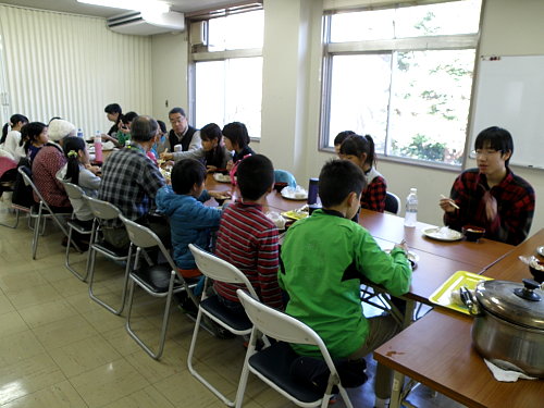 室内は既にお昼の準備が進められていましたので、作業の続きは午後にして、早目の昼食としました。 収穫祭とはいっても、用意した食事は玄米のおにぎりと具沢山の豚汁で、両方とも御代わりできる量は用意しました。 後は煮物、たくあん、きゃらぶき、大根とキュウリの浅漬けなどです。 それから、崎陽軒のシュウマイを1人2つずつ添えられました。これは、横浜市から来てくれている梅原先生からの差し入れでした。