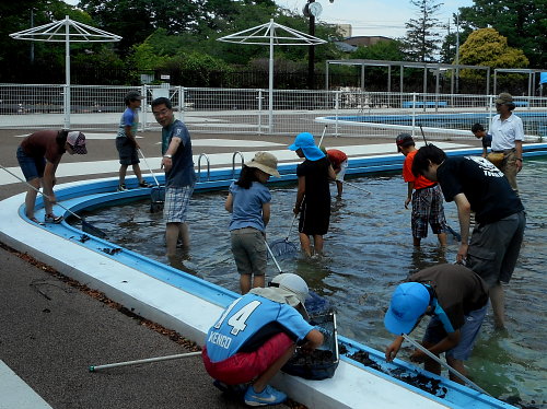 場所 稲田公園児童プール 参加者 中川 悠、山下はなの、田村 和、山下真奈実 伊東智勇、大橋拓真、沖本世織、工藤千穂、佐藤晴奈、軸丸陽希、富田勇樹、中野心吾、 村上柚葉、矢野 悠 14人 講師 藤間煕子、山本 晃、梅原和仁、岩田芳美、岩田臣生 サポート 神山幸雅 6人 第3回里山の自然学校はプールのヤゴの救出作戦です。 事務所内で、この日のミッションについて説明しました。 虫が苦手で触ることが出来ない子も頑張って、採集することができれば、下水に流されて死んでしまう命を救うことができます。 プールで見つかるヤゴについての勉強もしますが、何よりも、小さな命を救う体験をすることの意義は大きいと考えています。