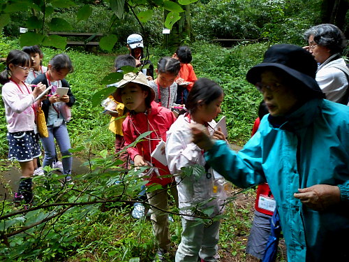 場所 生田緑地整備事務所2階、谷戸、ホタルの国 参加者 石井恵梨香、中川 悠、山下はなの、田村 和、山下真奈実 伊東智勇、大橋拓真、沖本世織、甲斐杏澄、工藤千穂、佐藤晴奈、軸丸陽希、富田勇樹、中野心吾、 村上柚葉、矢野 悠 16人 講師 藤間煕子、山本 晃、梅原和仁、岩田芳美、岩田臣生 サポート 神山幸雅 6人 第4回里山の自然学校は、ホタル観察です。 数人の参加者の保護者から「雨が降っているがやるのか?」という問い合わせがありましたが、小雨降る中、生田緑地整備事務所2階市民活動室に集合しました。 雷雨の場合は、流石に中止しますが、雨もまた自然ですので中止はしません。 しかし、夕方以降は使える施設がありませんので、雨の時はお弁当をどこで食べるかが問題です。 今回は幸いなことに、生田緑地整備事務所(生田緑地運営共同事業体)の職員が遅くまで残って作業しているとのことでしたので、18〜19時にも市民活動室を使わせてもらうことができました。 フィールドの活動も拠点がないと困難だと感じることが多々あります。 今回は、現場の職員の判断で対応していただけたことに感謝しています。 まず、前回のプールのヤゴの救出作戦で救出したトンボがどうなったかを聞いてみました。 救出した翌朝に羽化したものもあれば、まだ羽化する様子もないもの、羽化に失敗したもの、ヤゴのまま死んだものなど様々でした。 持ち帰ったヤゴの管理については、例年、山本先生からの解説があります。 採集したヤゴは羽化直前のものが多く、これらは何も食べずに羽化しますので、翌朝羽化したという報告がありました。 普通は、釣り具屋などで赤虫を買ってきて与えれば、2〜3匹食べてから羽化すると思います。 寧ろ大事なのはストレスを与えないことだと思います。持ち帰る時はペットボトルに水を満たして、中の水が動かないようにするとか、外の明暗に合わせて、夜は暗くするとか、そんなことを子どもたちが自分で考えて管理することを願っています。 ヤゴ(幼虫)からトンボ(成虫)に変態する場面は、自然の不思議を容易に感じることができる良い機会だと思います。 子どもたちの報告では 1/3が死んで、1/3が羽化して、1/3がまだヤゴのままという感じでした。