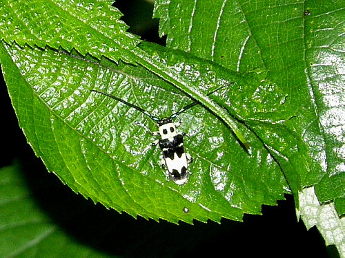 アオカラムシの葉にラミーカミキリがいました。 ラミーカミキリは、インドシナ半島、中国、台湾などに自然分布するカミキリムシで、ナンバンカラムシ(ラミー)の輸入に伴って非意図的に持ち込まれた生物で、関東地方以西に外来分布しています。 ここのアオカラムシの茎の中で幼虫が生活していると思われます。