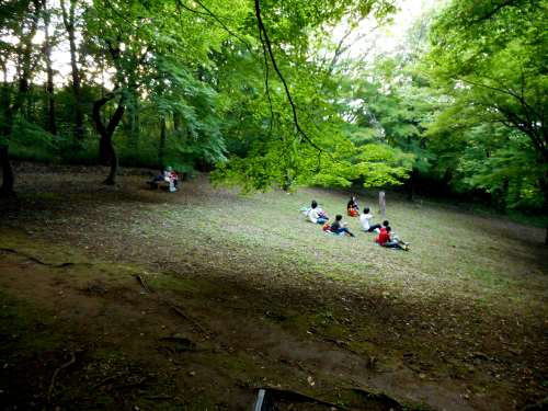 まず、夕方の生田緑地を歩きます。 生田緑地整備事務所に近いクヌギの樹液レストランは垣根が設置され、立ち入れなくなりました。 クヌギの皮を剥いでしまうマナーの悪い人が現れたようです。 園路から覗くとカナブンとクロカナブンが集まっていました。