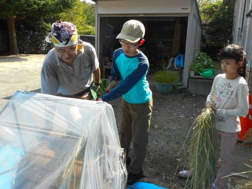 場所 生田緑地整備事務所裏 参加者 石川恵梨華、中川 悠、山下はなの、田村 和、山下真奈美 大橋拓真、甲斐杏澄、工藤千穂、佐藤晴奈、軸丸陽希、富田勇樹、村上柚葉、矢野 悠 13人 講師 岩田臣生、岩田芳美、藤間煕子、山本 晃、梅原和仁 サポート 神山幸雅、田村成美、山下淳也 8人 第9回里山の自然学校は、脱穀です。 今年の脱穀は晴れました。 毎年、この日は生田緑地整備事務所裏の掃除から始まりますが、事務所の作業スタッフがブロアーで応援してくれました。 次は脱穀機(だっこくき)と唐箕(とうみ)を出して調整を行い、準備は完了しました。