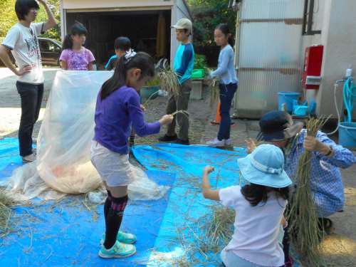 準備ができたところで、脱穀開始です。 まずは一人ずつ、稲穂(いなほ)の入れ方から体験しました。 茎がヘナヘナで、手を貸してあげないと脱穀機にかけることも難しい稲束も多く見られました。 後で聞いたら、このような稲束は初めのうちだけだったそうです。